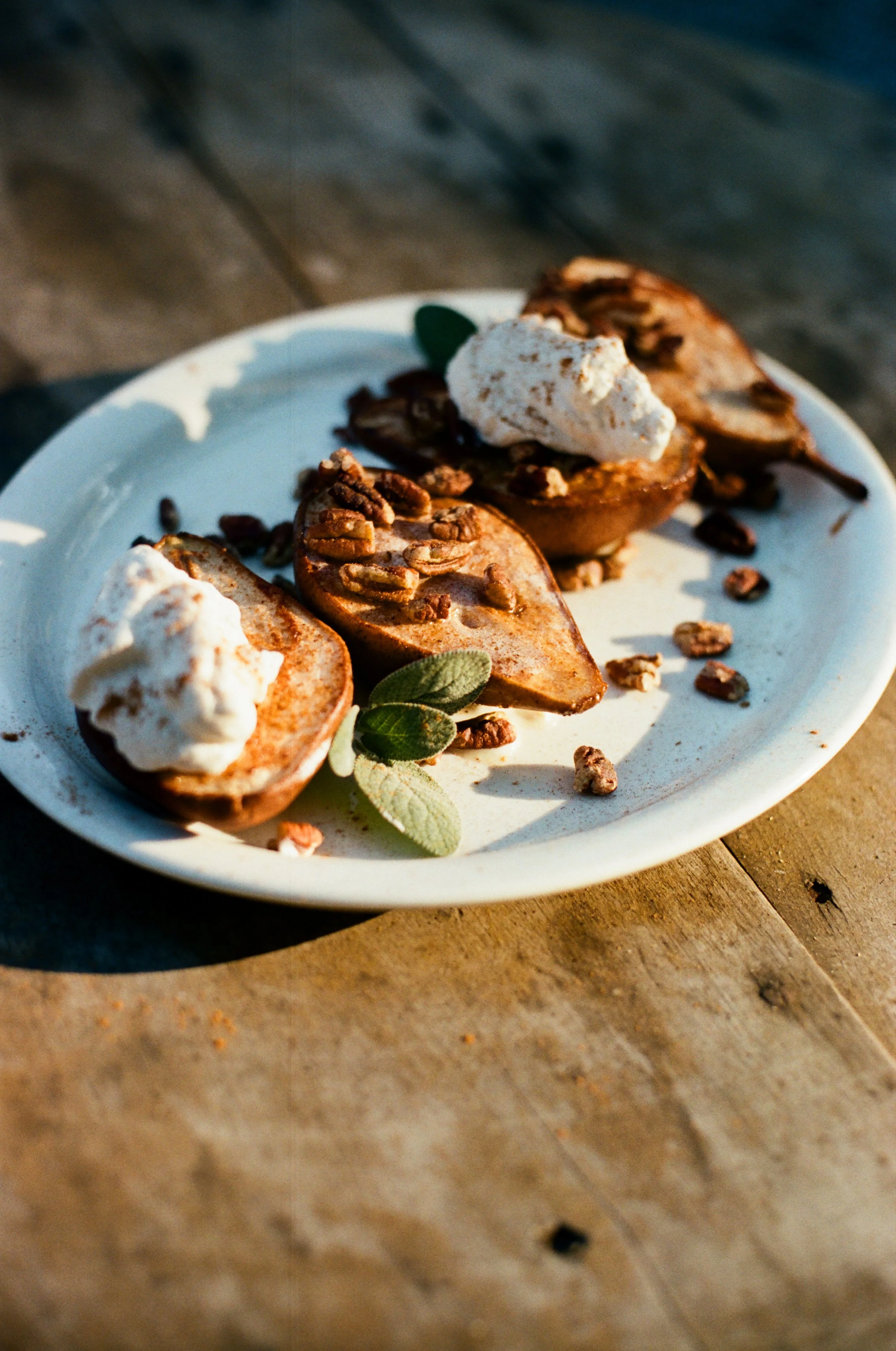 Roasted Pears with Bourbon Vanilla Bean Whipped Cream, Toasted Pecans and Spiced Honey