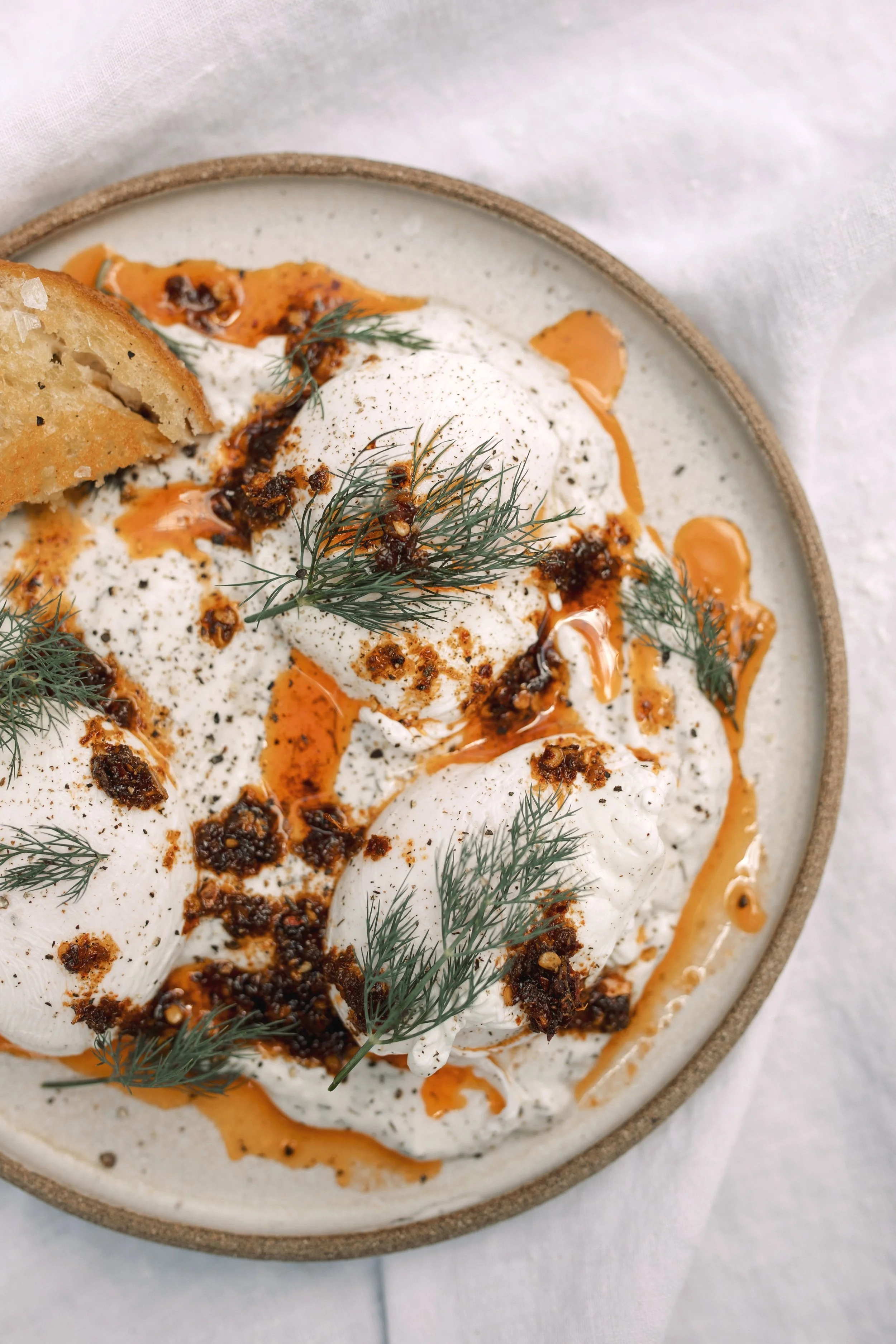 Place the poached eggs on top of the yogurt mixture. Drizzle the spiced butter over the eggs and yogurt. Sprinkle with crumbled feta cheese and garnish with fresh herbs. Serve immediately with toasted sourdough bread on the side for dipping.